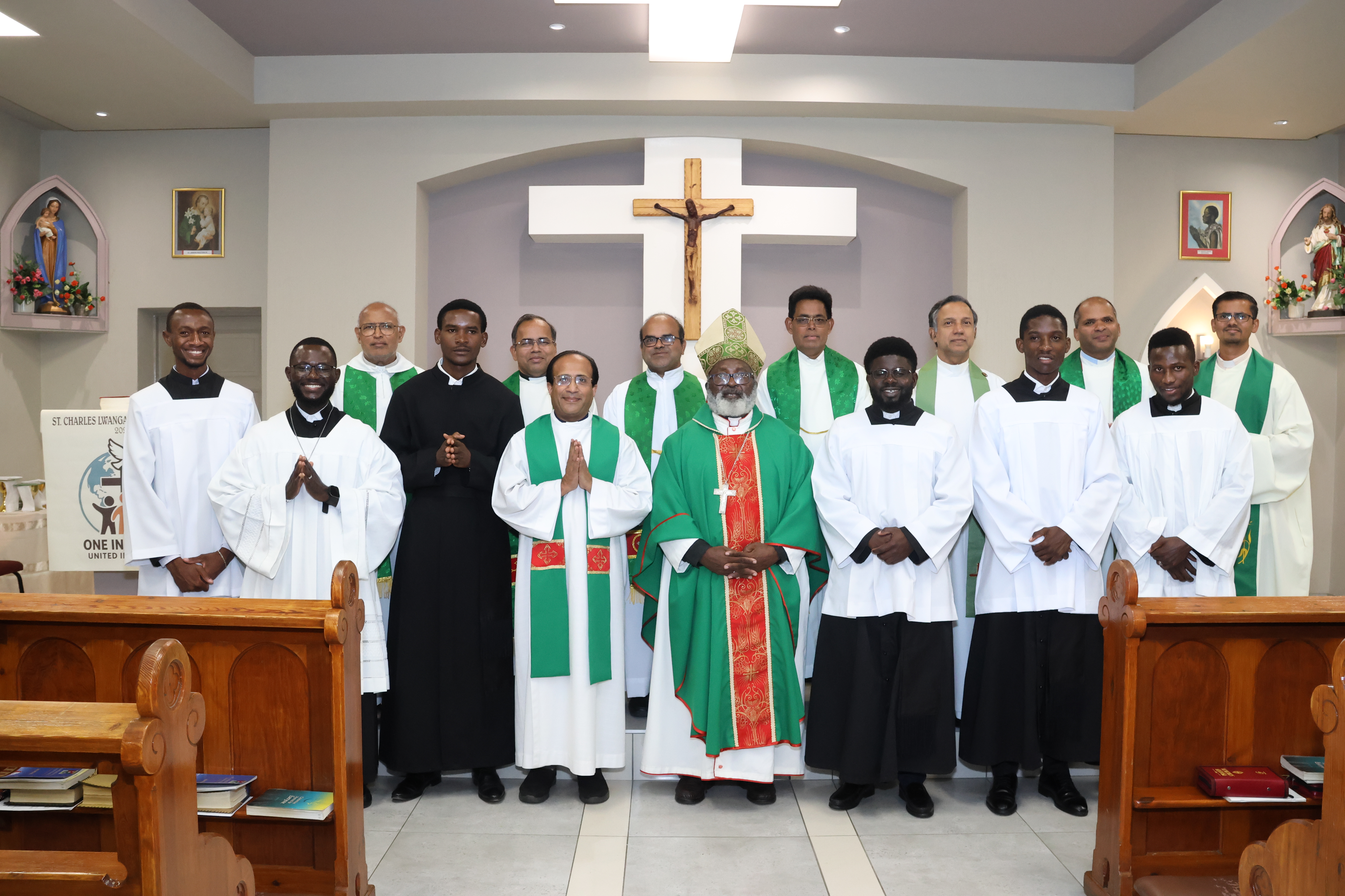 Acolytes of 2026: Hanghome Johannes, Iikukutu Lukas, Mwatukandje Herman, Shanyenenge Lukas, Zuze Sam Tangeni with Archbishop and Seminary Formators